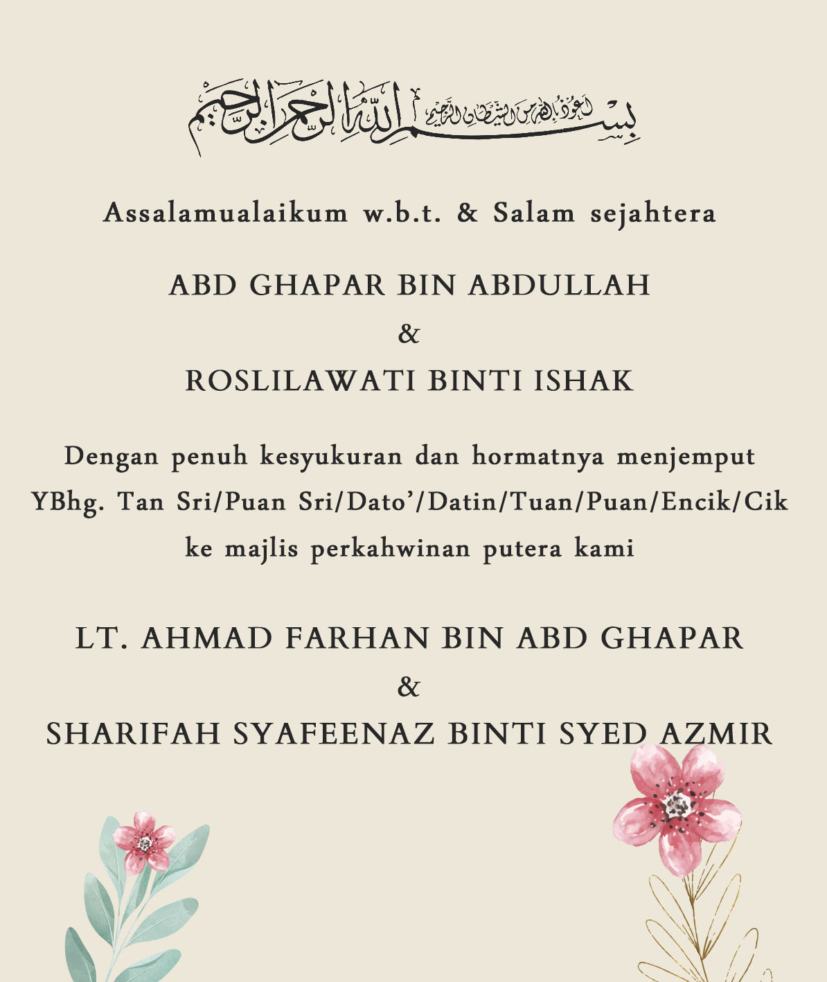 Undangan Majlis Perkahwinan Lt. Ahmad Farhan ♥ Sharifah Syafeenaz | 01.11.25
