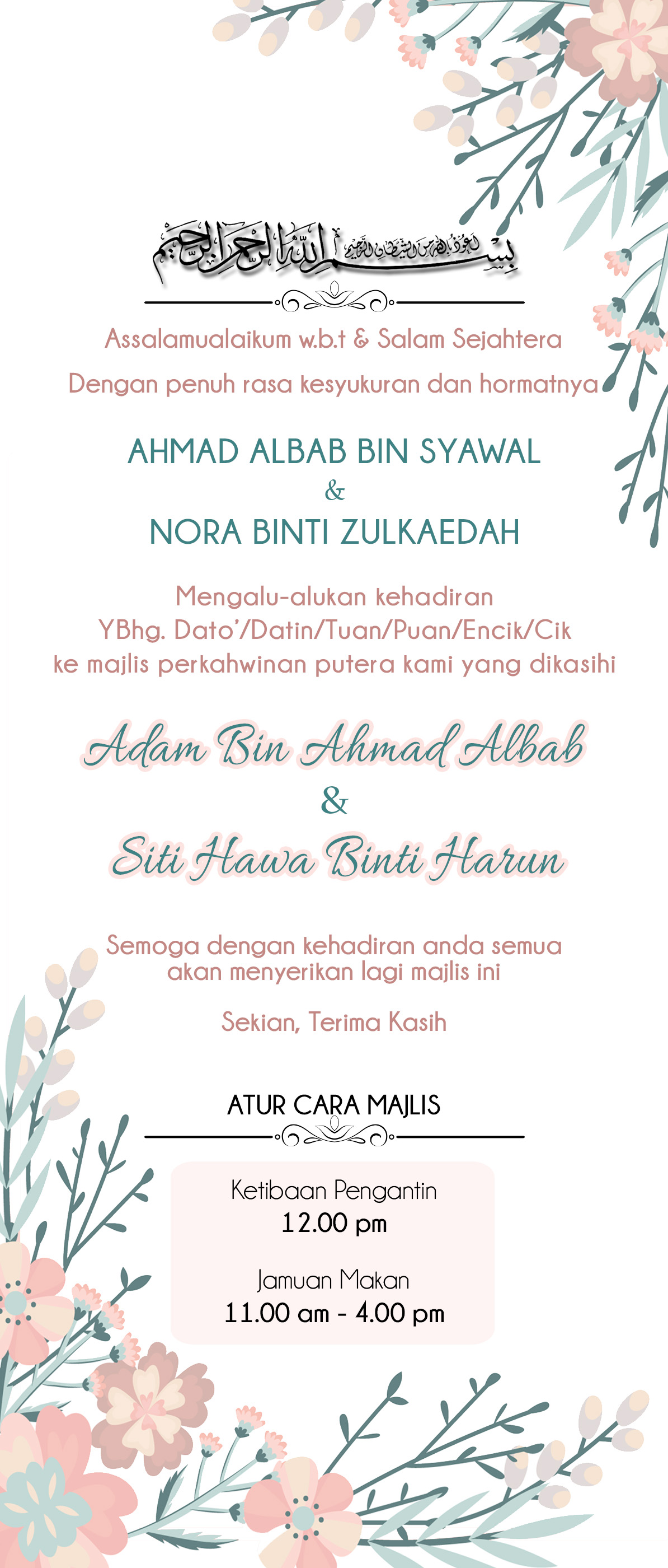 Ya Allah Yang Maha Mencipta. Jadikanlah majlis ini majlis yang mendapat keberkatan dan keredhaanMu, kekalkan ikatan perkahwinan mereka sepanjang hayat, tetapkan kasih sayang antara mereka selagi tidak melebihi kasih padaMu