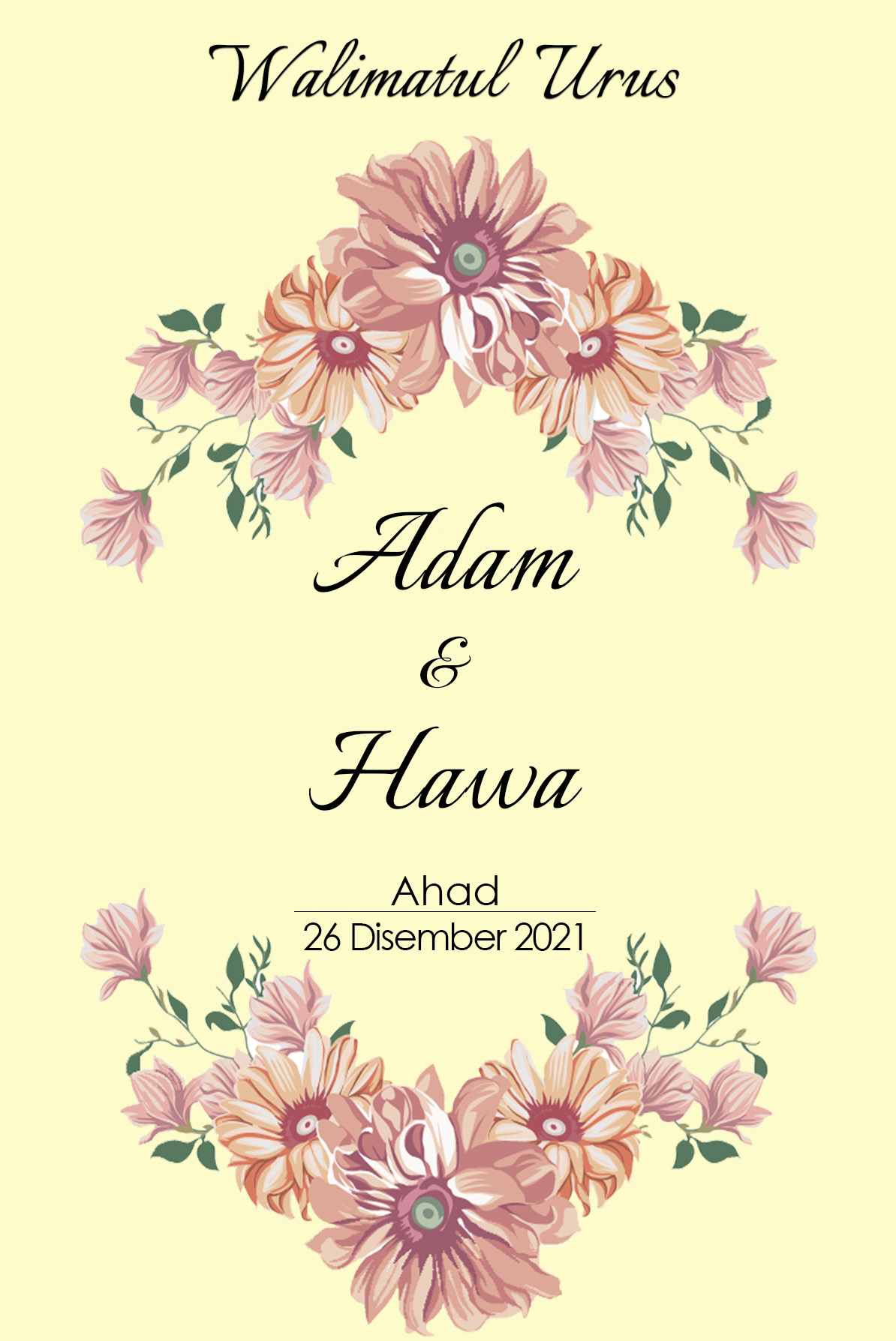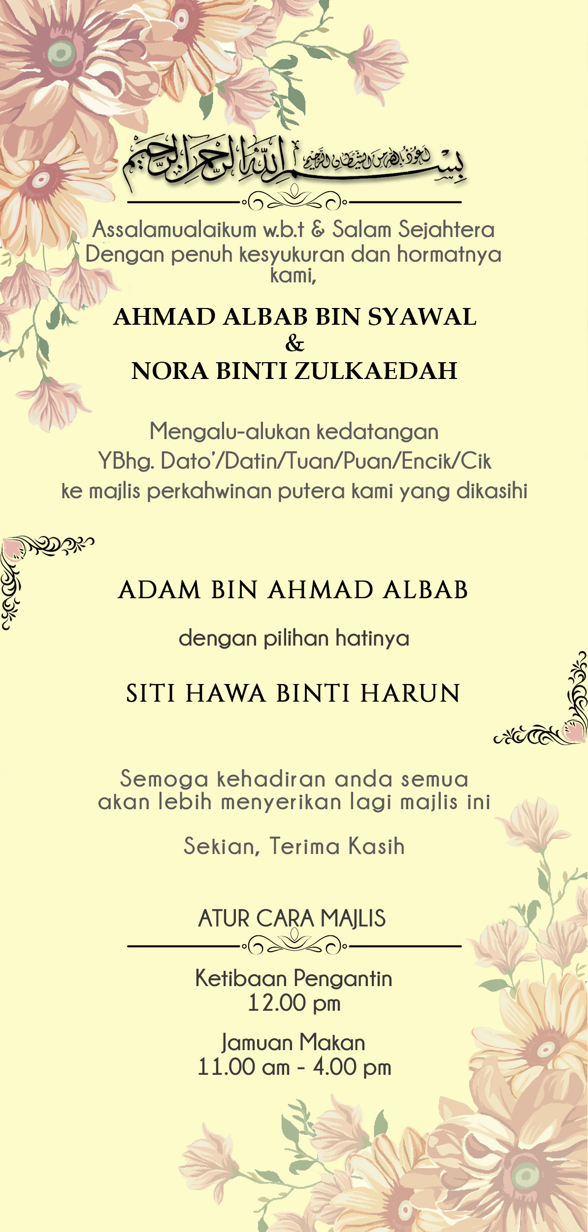 Ya Allah Yang Maha Mencipta. Jadikanlah majlis ini majlis yang mendapat keberkatan dan keredhaanMu, kekalkan ikatan perkahwinan mereka sepanjang hayat, tetapkan kasih sayang antara mereka selagi tidak melebihi kasih padaMu